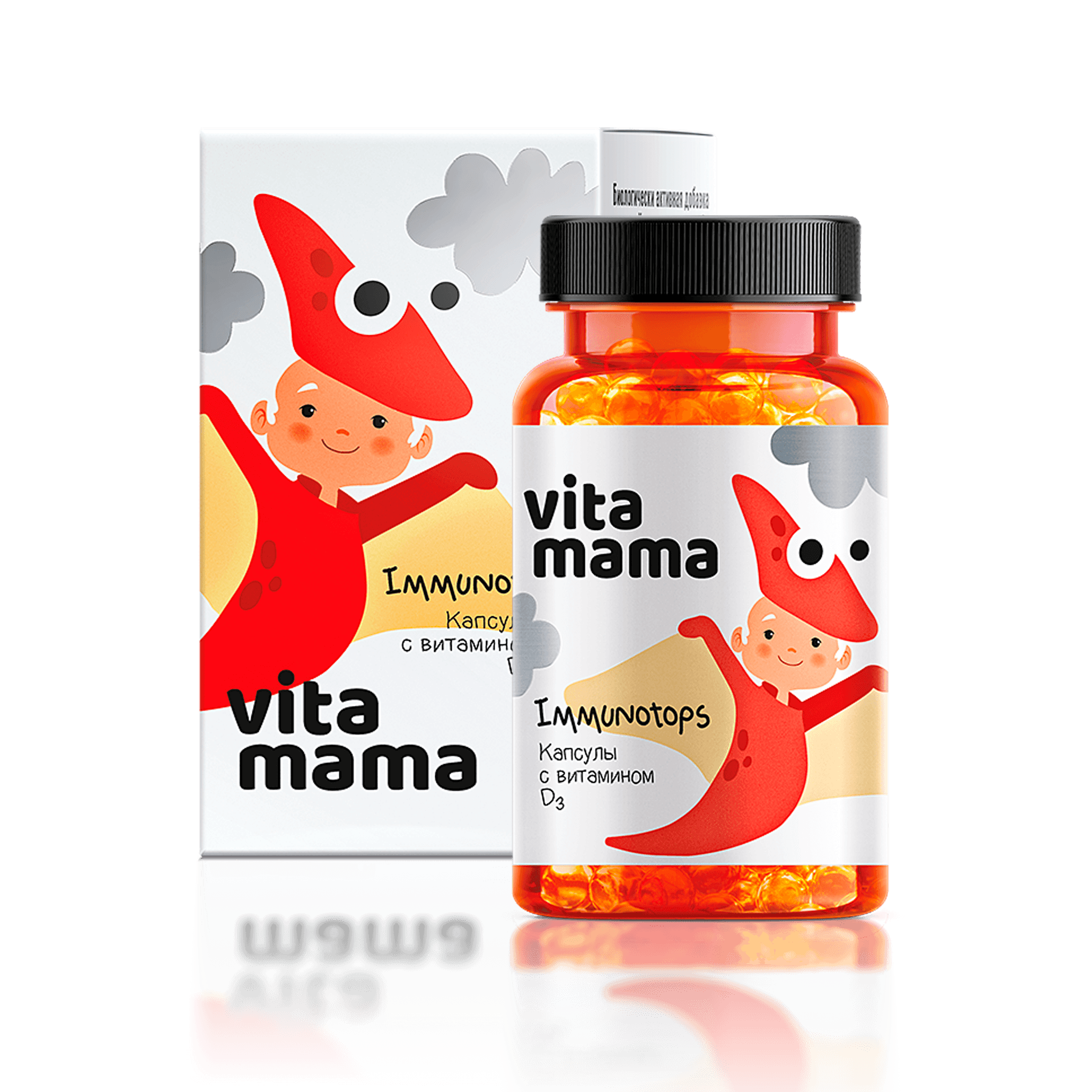 Есімдік майларының фракциялары (каприл/каприн триглицеридтері), D₃ дәрумені (холекальциферол). Капсула қабығы: сиыр еті желатині, глицерин (ылғалдандырғыш), су, ваниль сығындысы.